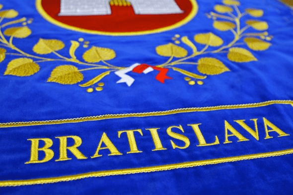 Bratislavský nástěnný znak. Slavnostní interiérové provedení pražského znaku. Umístění znaku Bratislavy je především určeno do reprezentativních prostorů úřadů, škol, ale i zasedacích a jednacích místností firem. Preciznost a řemeslnost provedení nástěnného znaku Bratislavy upoutá v každém detailu jeho propracování stínovanou výšivkou.