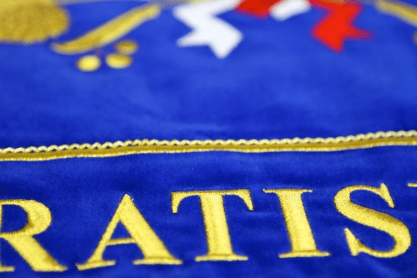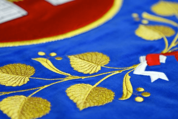 Materiál: vlajkový samet vysoké gramáže (460 Gr/m) a kvality rozměr vyšívaného znaku 70 x 100 cm.