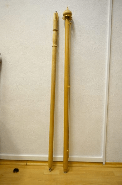 Interiérová vlajková žerď soustružená s dřevěnou cibulkou. Vlajková žerď je vyrobena v nejvyšší kvalitě z jasanového dřeva v různém moření a dvoudílném provedení. Proti otřepu je vlajková žerď chráněna zdobnou nerezovou patkou. Upevnění vlajky je vyřešeno speciálním mosazným kováním v zrcadlovém lesku.