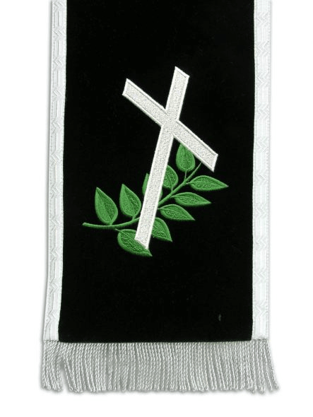 Jednostranná sametová smuteční stuha je dozdobena uměleckou výšivkou. Po stranách je našitá zdobná porta a dole stříbrné třásně. Smuteční stuha je dodávána včetně dřevěné hrazdičky i karabiny. Text ve stuze je pouze pro představu. Vždy je třeba úvést požadovaný text do poznámky.