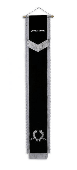 Sametová smuteční stuha je dozdobena uměleckou výšivkou. Po stranách je našita kroucená šňůra a dole stříbrné třásně. Smuteční stuha je dodávána včetně dřevěné hrazdičky a karabiny.