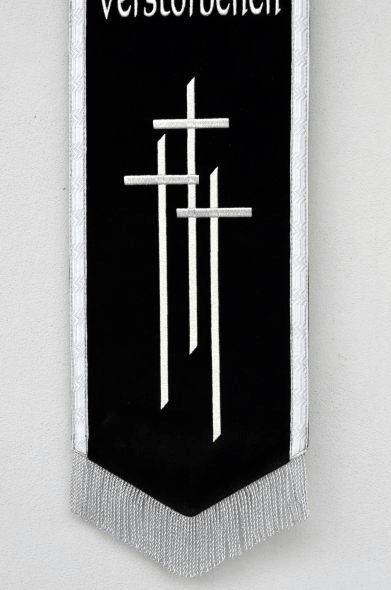 Sametová smuteční stuha je dozdobena uměleckou výšivkou. Po stranách je našita zdobná porta a dole a na překlopu stříbrné třásně. Smuteční stuha je dodávána včetně dřevěné hrazdičky a karabiny. Text ve stuze je pouze pro představu. Vždy je třeba uvést požadovaný text do poznámky.